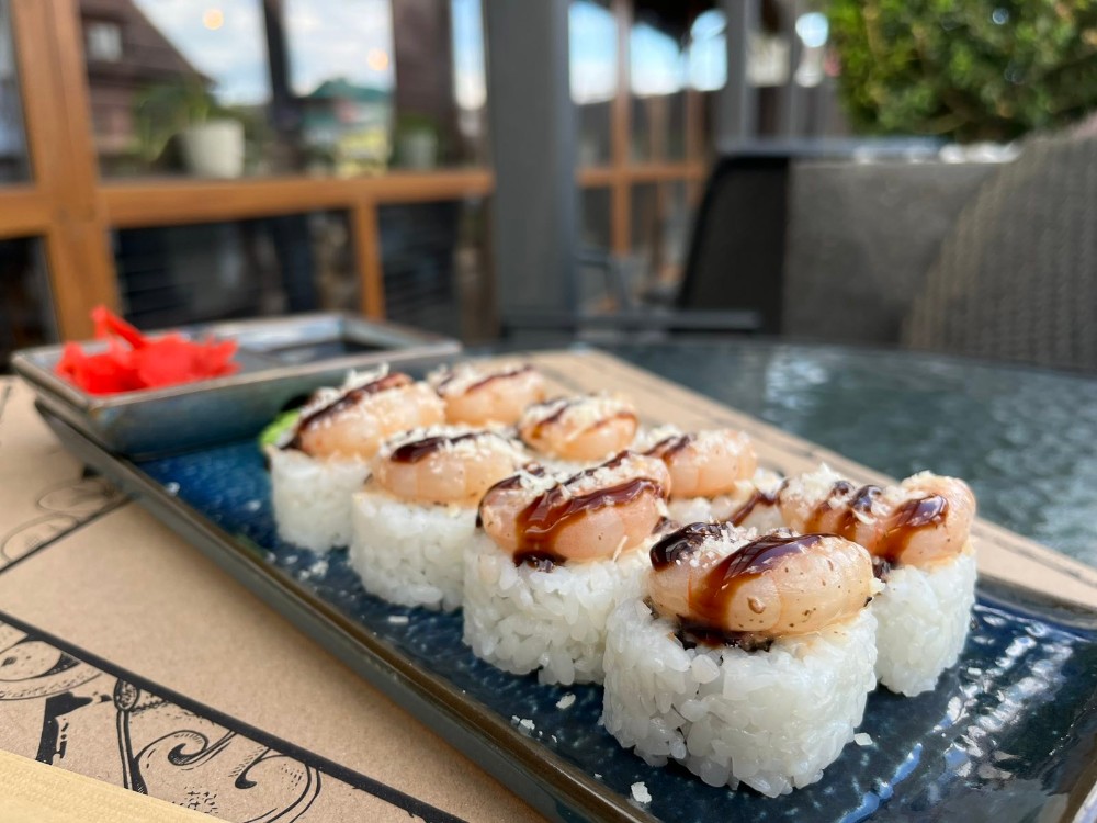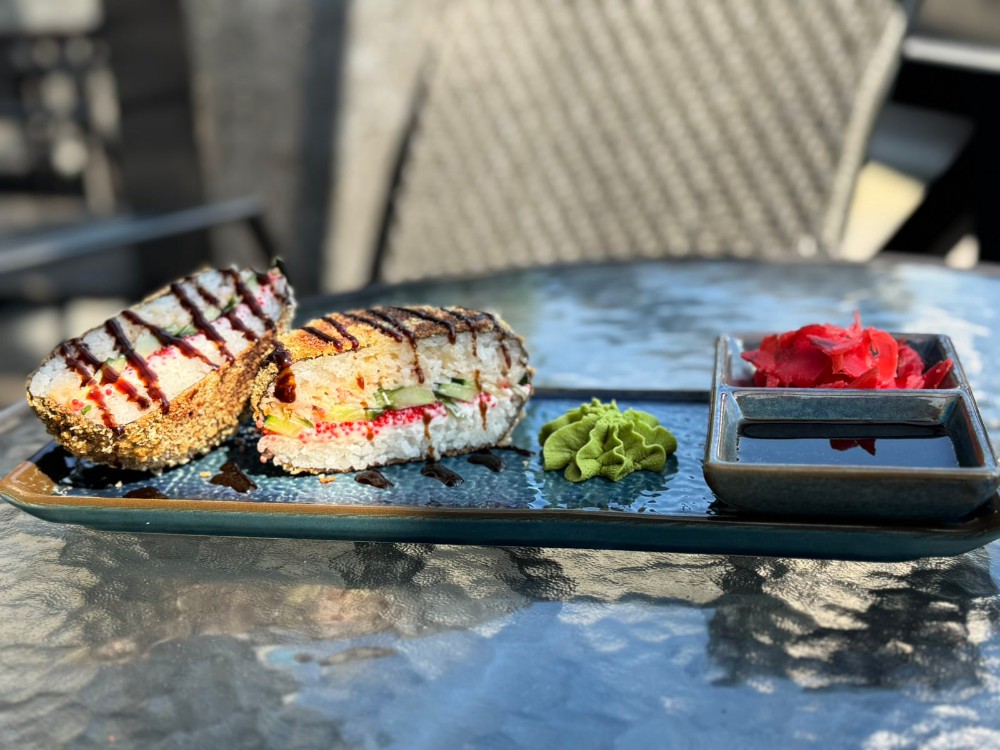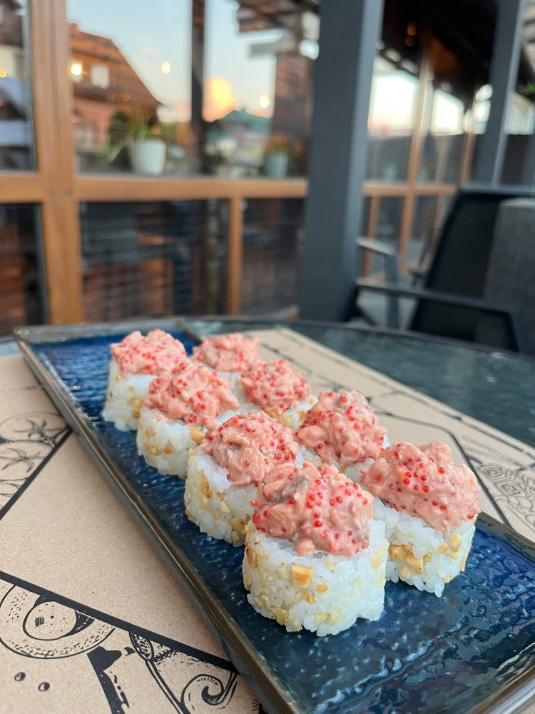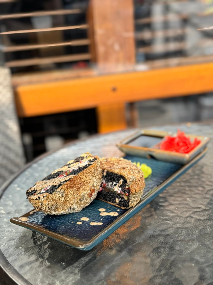 рис,норі,авокадо,смажений лосось, огірок,кунжут
